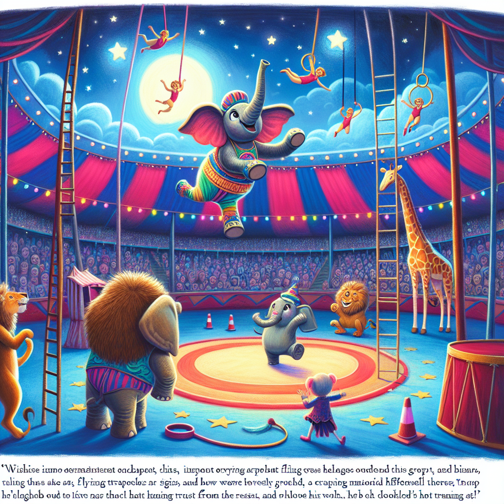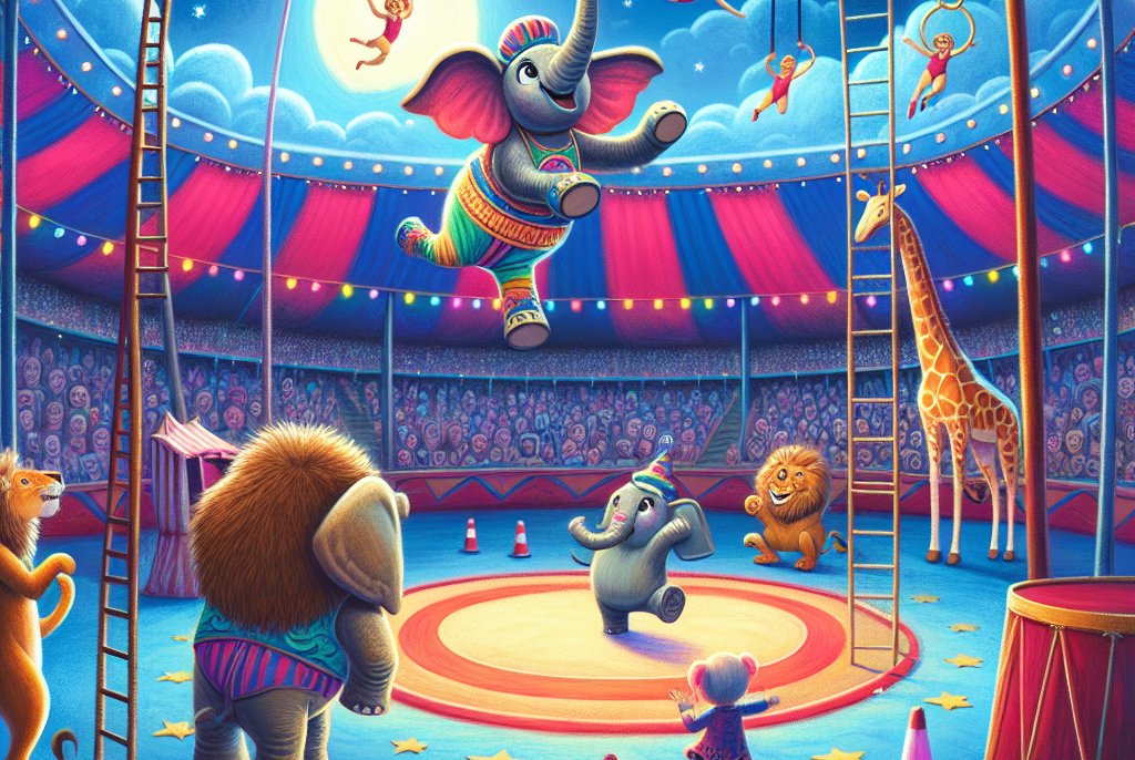 Il était une fois, dans un cirque coloré et joyeux, un éléphant nommé Jumbo. Jumbo était un éléphant marrant qui adorait faire rire ses amis avec ses blagues et ses pitreries. Mais ce que Jumbo voulait vraiment, c’était devenir trapéziste ! Il voyait les acrobates sauter et voler dans les airs avec tant de grâce, et son cœur battait fort d’envie.Un jour, alors qu’il se promenait près de la piste, Jumbo s’approcha d’un groupe de trapézistes. Ils s’entraînaient à rire et à s’amuser en sautant de barre en barre. « Bonjour ! Comment puis-je devenir trapéziste ? » demanda Jumbo, avec des étoiles dans les yeux.Les trapézistes, d’abord un peu surpris de voir un si grand éléphant, rirent gentiment. « Mais Jumbo, tu es trop grand et lourd pour sauter dans les airs comme nous ! »Jumbo se sentit triste. Mais au fond de lui, une petite voix lui chuchotait que tout était possible s’il y croyait. Alors, il décida de s’entraîner ! Il s’installa dans un coin du cirque, dessina des cerceaux sur le sol, et voilà qu’il commença à sauter à l’intérieur ! Au début, il ne réussit qu’à faire des petites pirouettes. Mais chaque jour, il revenait avec le sourire et recommençait, déterminé à améliorer ses mouvements.Les autres animaux du cirque commencèrent à le soutenir. Le lion l’encourageait à sauter un peu plus haut, la girafe expliquait comment se placer correctement, et même le clown lui faisait des blagues pour le faire rire pendant qu’il s’entraînait.Peu à peu, Jumbo devint très habile aux cerceaux. Le jour du grand spectacle approchait, et Jumbo ressentait une joie immense, même s’il savait qu’il ne pouvait pas sauter exactement comme les autres. Le soir du spectacle, la piste était remplie d’enfants et de familles qui attendaient avec impatience de voir les acrobates. Quand c’était enfin son tour, Jumbo avait le cœur qui battait très fort. Il prit une grande inspiration, se rappelant de tous les encouragements de ses amis.Avec assurance, Jumbo s’élança. Il sauta à travers un cerceau ! Puis un autre ! Et encore un autre ! À la fin, il fit une grande pirouette et atterrit avec un sourire éclatant.La foule éclata en applaudissements ! Jumbo avait réussi à créer un numéro unique. Même s’il n’était pas un trapéziste traditionnel, il avait fait quelque chose d’encore plus spécial : il avait montré que l’on peut être soi-même et suivre ses rêves de façon unique et joyeuse.À partir de ce jour-là, Jumbo ne devint pas seulement un éléphant trapéziste, il devint aussi la vedette du cirque. Et il n’oubliera jamais que le plus important est d’y croire et de s’amuser !Moralité: