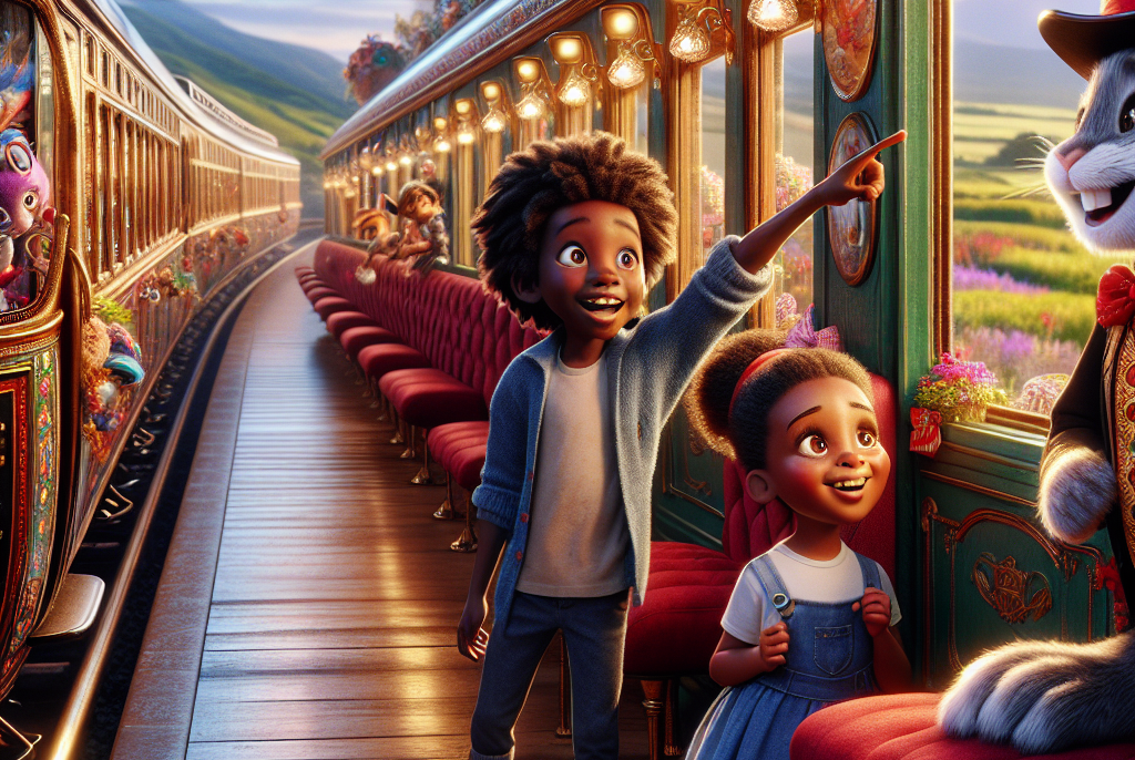 Un jour ensoleillé, Sacha, le petit garçon malin, et Ophélie, la fille dégourdie, décidèrent d’explorer un train qui était garé à la gare de leur village. Ce train avait l’air très ancien, avec des wagons colorés et des fenêtres brillantes. Sacha, avec ses yeux pétillants de curiosité, dit à Ophélie : « Allons voir ce qui se cache à l’intérieur ! »Ils montèrent tous deux dans le train. À l’intérieur, ils découvrirent des sièges en velours rouge et des lumières scintillantes. Au moment où ils s’assirent, le train se mit à bouger tout doucement. « Oh non, il s’éloigne ! » s’exclama Ophélie.Sacha, toujours calme, répondit : « Ne t’inquiète pas, Ophélie. Nous allons vivre une aventure incroyable ! » Le train passa devant des paysages magnifiques : des champs fleuris, des rivières étincelantes et des montagnes majestueuses.Au bout d’un moment, ils rencontrèrent un drôle de lapin aux grandes oreilles qui portait un chapeau haut de forme. Le lapin leur sourit et dit : « Bienvenue à bord du train enchanté ! Ici, chaque wagon cache une surprise. »Sacha et Ophélie étaient émerveillés. Ils décidèrent de découvrir chaque wagon. Dans le premier, ils trouvèrent des bonbons de toutes les couleurs. Dal’in, ils allaient dans un autre wagon plein de jouets magiques qui dansaient tout seuls ! Sacha et Ophélie riaient aux éclats.Mais soudain, le train s’arrêta. Le lapin leur expliqua qu’ils devaient résoudre une énigme pour continuer leur voyage. « Quel animal dit ‘meuh’ ? » demanda-t-il. Sacha réfléchit et répondit en souriant : « C’est la vache ! » Le lapin applaudit et le train redémarra.Après encore quelques wagons, ils arrivèrent à un jardin secret rempli de fleurs qui parlaient ! Les fleurs chantaient et dansaient au rythme du vent. Ophélie proposa d’y rester un peu pour jouer, et Sacha acquiesça, sachant qu’ils avaient encore des mystères à découvrir.Finalement, après une journée pleine de surprises, le train les ramena doucement vers leur village. En descendant, Sacha dit à Ophélie : « Quelle aventure incroyable ! » Ophélie répondit avec un grand sourire : « Oui ! Et je suis contente d’avoir partagé tout cela avec toi ! »Sacha et Ophélie promirent de retourner un jour dans le train enchanté pour vivre encore plus d’aventures. Le lapin les salua de la main, les yeux brillants de magie.Et c’est ainsi que leurs cœurs étaient remplis de joie, prêts à découvrir encore plein d’autres merveilles.Moralité:
