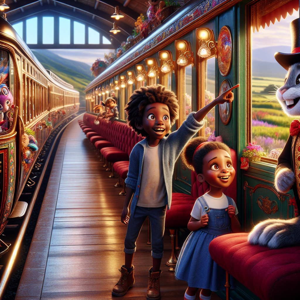 Un jour ensoleillé, Sacha, le petit garçon malin, et Ophélie, la fille dégourdie, décidèrent d’explorer un train qui était garé à la gare de leur village. Ce train avait l’air très ancien, avec des wagons colorés et des fenêtres brillantes. Sacha, avec ses yeux pétillants de curiosité, dit à Ophélie : « Allons voir ce qui se cache à l’intérieur ! »Ils montèrent tous deux dans le train. À l’intérieur, ils découvrirent des sièges en velours rouge et des lumières scintillantes. Au moment où ils s’assirent, le train se mit à bouger tout doucement. « Oh non, il s’éloigne ! » s’exclama Ophélie.Sacha, toujours calme, répondit : « Ne t’inquiète pas, Ophélie. Nous allons vivre une aventure incroyable ! » Le train passa devant des paysages magnifiques : des champs fleuris, des rivières étincelantes et des montagnes majestueuses.Au bout d’un moment, ils rencontrèrent un drôle de lapin aux grandes oreilles qui portait un chapeau haut de forme. Le lapin leur sourit et dit : « Bienvenue à bord du train enchanté ! Ici, chaque wagon cache une surprise. »Sacha et Ophélie étaient émerveillés. Ils décidèrent de découvrir chaque wagon. Dans le premier, ils trouvèrent des bonbons de toutes les couleurs. Dal’in, ils allaient dans un autre wagon plein de jouets magiques qui dansaient tout seuls ! Sacha et Ophélie riaient aux éclats.Mais soudain, le train s’arrêta. Le lapin leur expliqua qu’ils devaient résoudre une énigme pour continuer leur voyage. « Quel animal dit ‘meuh’ ? » demanda-t-il. Sacha réfléchit et répondit en souriant : « C’est la vache ! » Le lapin applaudit et le train redémarra.Après encore quelques wagons, ils arrivèrent à un jardin secret rempli de fleurs qui parlaient ! Les fleurs chantaient et dansaient au rythme du vent. Ophélie proposa d’y rester un peu pour jouer, et Sacha acquiesça, sachant qu’ils avaient encore des mystères à découvrir.Finalement, après une journée pleine de surprises, le train les ramena doucement vers leur village. En descendant, Sacha dit à Ophélie : « Quelle aventure incroyable ! » Ophélie répondit avec un grand sourire : « Oui ! Et je suis contente d’avoir partagé tout cela avec toi ! »Sacha et Ophélie promirent de retourner un jour dans le train enchanté pour vivre encore plus d’aventures. Le lapin les salua de la main, les yeux brillants de magie.Et c’est ainsi que leurs cœurs étaient remplis de joie, prêts à découvrir encore plein d’autres merveilles.Moralité: