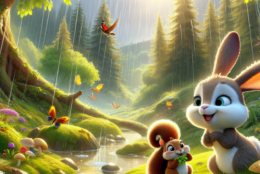 Il était une fois, dans une forêt douce, deux amis très spéciaux : Pinpin le lapin malin et Roucky l’écureuil joyeux. Pinpin avait de grandes oreilles toutes douces, et Roucky avait une petite queue toute bouclée.Un jour, le ciel s’assombrit et de petites gouttes commencèrent à tomber. “Oh non, la pluie arrive !” dit Pinpin. Il attrapa la main de Roucky et tous deux coururent vite, vite, jusqu’à leur terrier tout chaud où ils pouvaient se cacher.Dans leur terrier, ils écoutaient la pluie tomber. “Écoute, dit Roucky, la pluie raconte une chanson sur les fleurs qui grandissent et les petits ruisseaux qui jouent.” Pinpin sourit, “Oui, la pluie fait du bien à la forêt.”Après un moment, la pluie s’arrêta. Petit à petit, un grand soleil jaune et doux pointa son nez. Pinpin bondit de joie, “Le soleil revient ! C’est l’heure de sortir jouer !” Roucky sautilla partout, “Vite, vite, allons voir les papillons !”Alors ils sortirent du terrier, sentirent l’air frais et firent la course entre les arbres, riaient avec les papillons et sautaient dans les flaques d’eau.Et depuis ce jour, Pinpin et Roucky comprirent que la pluie et le soleil sont tous les deux très importants. L’un fait pousser les plantes, l’autre fait briller la forêt pour jouer.Chaque fois que la pluie venait, ils se blottissaient dans leur terrier en pensant à toutes les belles choses à venir. Et quand le soleil revenait, ils sortaient pour s’amuser ensemble, heureux et complices.Moralité: