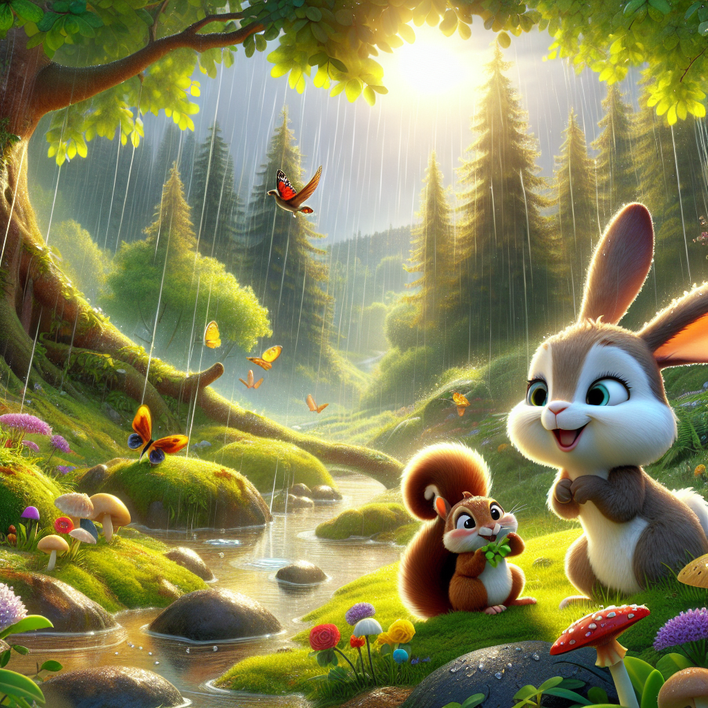 Il était une fois, dans une forêt douce, deux amis très spéciaux : Pinpin le lapin malin et Roucky l’écureuil joyeux. Pinpin avait de grandes oreilles toutes douces, et Roucky avait une petite queue toute bouclée.Un jour, le ciel s’assombrit et de petites gouttes commencèrent à tomber. “Oh non, la pluie arrive !” dit Pinpin. Il attrapa la main de Roucky et tous deux coururent vite, vite, jusqu’à leur terrier tout chaud où ils pouvaient se cacher.Dans leur terrier, ils écoutaient la pluie tomber. “Écoute, dit Roucky, la pluie raconte une chanson sur les fleurs qui grandissent et les petits ruisseaux qui jouent.” Pinpin sourit, “Oui, la pluie fait du bien à la forêt.”Après un moment, la pluie s’arrêta. Petit à petit, un grand soleil jaune et doux pointa son nez. Pinpin bondit de joie, “Le soleil revient ! C’est l’heure de sortir jouer !” Roucky sautilla partout, “Vite, vite, allons voir les papillons !”Alors ils sortirent du terrier, sentirent l’air frais et firent la course entre les arbres, riaient avec les papillons et sautaient dans les flaques d’eau.Et depuis ce jour, Pinpin et Roucky comprirent que la pluie et le soleil sont tous les deux très importants. L’un fait pousser les plantes, l’autre fait briller la forêt pour jouer.Chaque fois que la pluie venait, ils se blottissaient dans leur terrier en pensant à toutes les belles choses à venir. Et quand le soleil revenait, ils sortaient pour s’amuser ensemble, heureux et complices.Moralité:
