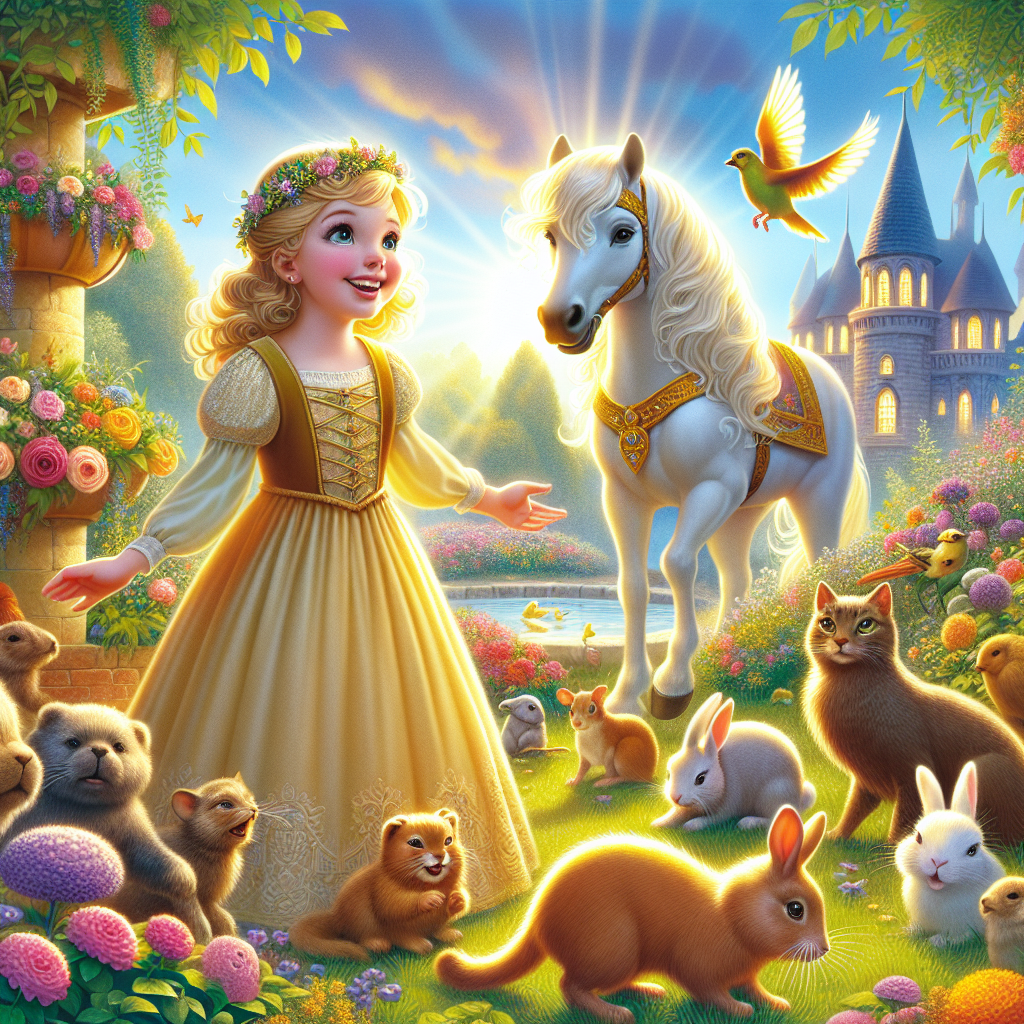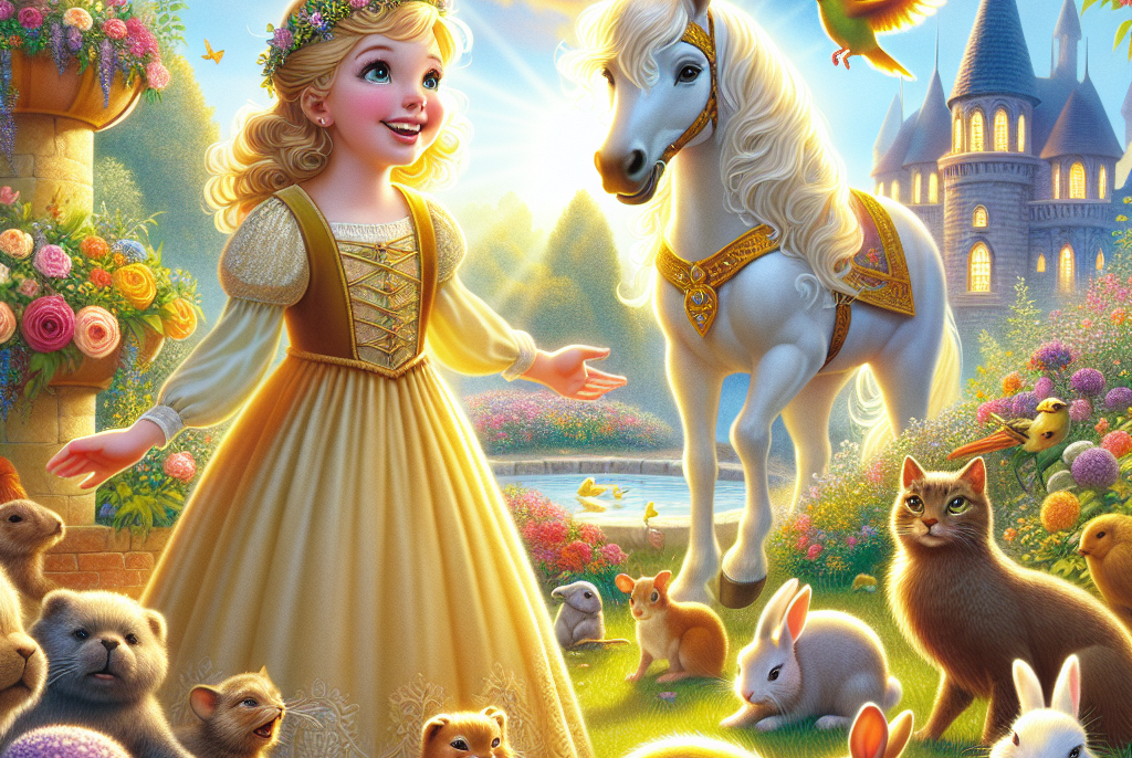 Il était une fois, dans un joli château, une petite princesse nommée Lili. Lili adorait les animaux, surtout les chevaux. Elle passait ses journées à jouer avec les lapins, à caresser les chats, et à nourrir les oiseaux. Mais dans son cœur, il y avait un grand rêve : avoir un cheval à elle.Un jour, Lili regarda par la fenêtre de sa chambre. Elle vit un magnifique cheval dans le jardin, le cheval avait une jolie crinière dorée qui brillait au soleil. Lili s’exclama : “Oh, comme j’aimerais avoir un cheval ! Je pourrais faire des balades avec lui et l’aimer très fort ! “Lili décida qu’elle allait parler à son papa, le roi. Elle s’approcha de lui et dit : “Papa, je voudrais avoir un cheval. Je promets de bien m’en occuper et de le chouchouter ! ” Le roi, avec un sourire, lui répondit : “Ma petite Lili, un cheval est un grand engagement. Mais je vois que tu aimes les animaux ! “Le roi proposa une idée. “Si tu veux vraiment un cheval, tu dois d’abord bien prendre soin de tes petits amis ici, dans le château. ” Lili accepta avec enthousiasme. Elle se mit à nourrir les animaux de la ferme, à jouer avec eux et même à nettoyer leurs enclos.Les jours passèrent, et Lili prit grand soin de tous les animaux. Elle leur parlait doucement, les câlinait et les faisait jouer. Les lapins devenaient de plus en plus joyeux, et les chats ronronnaient de bonheur. Un matin, le roi la félicita : “Bravo, Lili ! Tu as montré que tu pouvais être responsable. Il est temps de réaliser ton rêve. ” Le roi invita Lili dans le jardin, et là, elle découvrit une belle surprise : un cheval! C’était le cheval aux crins dorés qu’elle avait vu par la fenêtre. Lili sauta de joie et courut vers lui. Elle l’appela, et il s’approcha avec des yeux doux.Depuis ce jour, Lili et son cheval étaient inséparables. Elles s’amusaient ensemble, galopaient dans le jardin, et partageaient de tendres moments. Lili comprit alors que prendre soin des autres est la clé pour recevoir ce que l’on désire le plus.Moralité: