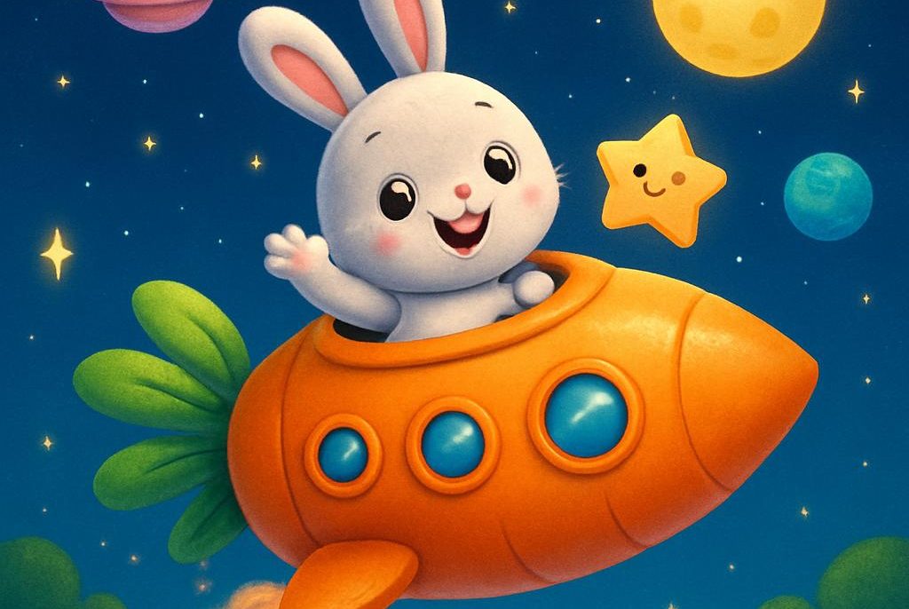 Dans une jolie clairière, vivait un petit lapin nommé Ponpon. Ponpon était très malin et adorait rêver. Mais ce qu’il aimait le plus, c’était imaginer qu’il voyageait dans l’univers, parmi les étoiles et les planètes.Un jour, Ponpon eut une idée géniale : construire une fusée en forme de carotte, son légume préféré ! Il travailla très dur, coupant, collant et peignant, jusqu’à ce que sa fusée-carotte soit prête. Elle était orange brillante, avec des fenêtres rondes et un moteur qui faisait un bruit rigolo.Le soir venu, Ponpon monta dans sa fusée. Il appuya sur un gros bouton rouge et, whoosh ! La fusée s’envola dans le ciel. Plus haut, plus haut, jusqu’à quitter la Terre. Ponpon voyait les étoiles scintiller et des planètes toutes colorées. Il rencontrait même une petite étoile qui lui fit un clin d’œil.Mais soudain, la fusée commença à ralentir. Ponpon regarda dehors et vit qu’il s’approchait d’une grosse planète toute grise. Il se rappela alors qu’il avait oublié d’apporter des carottes pour ne pas avoir faim. Il pensa : « Peut-être que je devrais revenir à la maison pour préparer mieux mon voyage. »Avec un sourire, Ponpon fit demi-tour. De retour sur la Terre, il partagea son aventure avec ses amis et leur expliqua que même quand on rêve beaucoup, il faut aussi bien se préparer pour réussir.Alors, tous ensemble, ils construisirent une autre fusée-carotte, encore plus belle, et cette fois, avec assez de carottes pour tout le voyage. Ponpon savait que ses rêves les plus fous pouvaient devenir réalité, à condition de ne jamais arrêter d’essayer et de bien se préparer.Moralité: