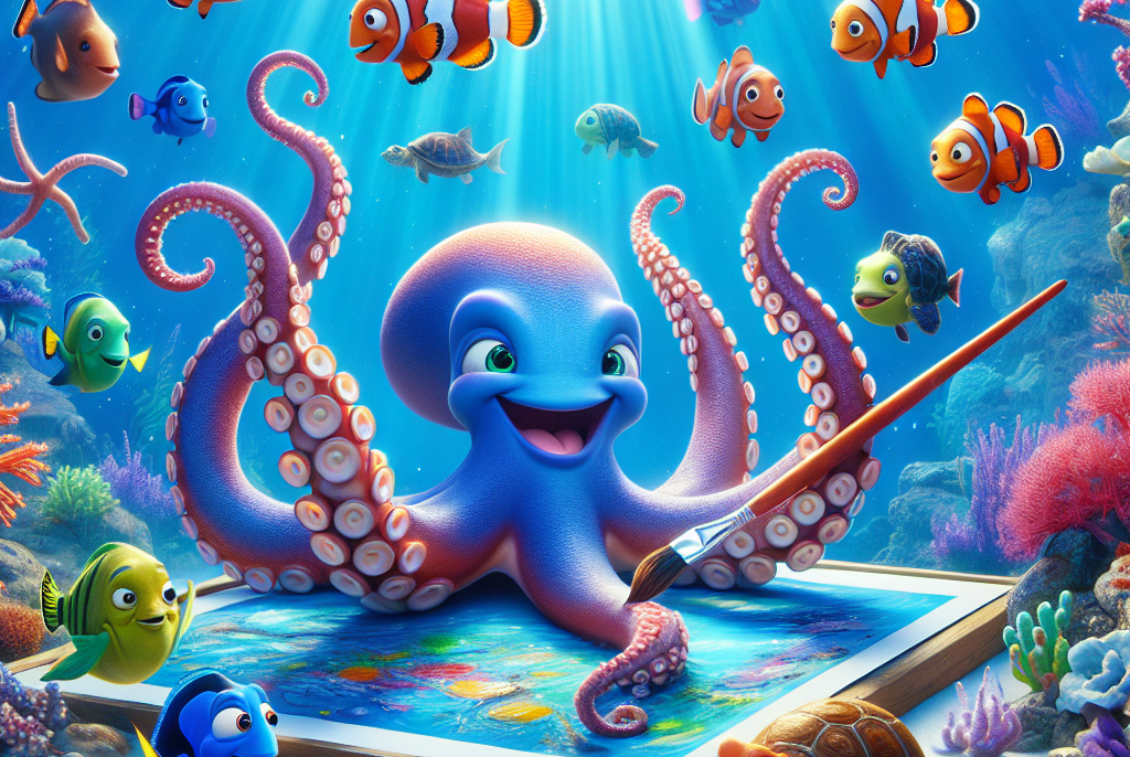 Dans un grand océan bleu où dansaient les poissons et chantaient les coquillages, vivait Poulpie, la pieuvre la plus talentueuse de toutes les profondeurs marines. Chaque jour, Poulpie se réveillait avec une nouvelle idée pour créer de magnifiques œuvres d’art. Il adorait peindre avec les couleurs éclatantes des algues et des coraux, et ses amis venaient souvent admirer ses créations.Un matin ensoleillé, Poulpie décida de préparer une grande exposition pour ses amis. “Je vais peindre un tableau géant de l’océan rempli de couleurs brillantes!” s’exclama-t-il, ses yeux pétillant d’excitation. Il se mit au travail, plongeant ses tentacules dans le bleu des vagues et le vert des algues.Ses amis, le poisson clown nommé Dali, la tortue sage appelée Tilly, et le crabe malicieux, Crabouille, s’étaient réunis pour l’encourager. “Tu es le meilleur artiste de l’océan, Poulpie!” s’écria Dali. Tilly hocha la tête, ajoutant : “Nous avons hâte de voir ton chef-d’œuvre!”Alors que Poulpie peignait, il remarqua que ses amis le regardaient avec admiration. Mais un jour, quelque chose d’étrange se produisit. En peignant, Poulpie commença à douter de lui-même. “Et si je ne réussis pas à faire quelque chose de beau ?” pensa-t-il, tremblant légèrement.Crabouille, qui avait vu l’inquiétude dans les yeux de Poulpie, s’approcha doucement. “Pourquoi ne pas ajouter un peu de rouge ici, et peut-être un peu de jaune par là?” proposa-t-il avec un sourire. Ces réflexions d’amis lui redonnèrent de la confiance. Poulpie se souvint alors que l’art, c’était aussi s’amuser et partager des moments avec ceux qu’il aimait.Finalement, le jour de l’exposition arriva. L’eau brillait de mille feux et tous les animaux marins étaient là : les poissons, les étoiles de mer et même quelques dauphins! Quand Poulpie dévoila son tableau, tous firent silence. Le tableau représentait un océan éclatant, avec des poissons colorés jouant parmi les vagues.Ses amis applaudirent et crièrent : “Bravo Poulpie! C’est magnifique!” La fierté emplit le cœur de la pieuvre. Il réalisa que ce n’était pas tant le tableau qui importait, mais le plaisir qu’il avait eu à créer et le soutien de ses amis qui le rendait heureux.Et depuis ce jour, Poulpie continua à peindre non seulement pour lui, mais aussi pour partager la joie et l’amour qu’il ressentait. Ainsi, chaque œuvre était un symbole d’amitié et de bonheur dans l’océan.Poulpie avait appris que l’important n’était pas de faire des choses parfaites, mais de partager sa passion avec ceux qu’il aimait.Moralité: