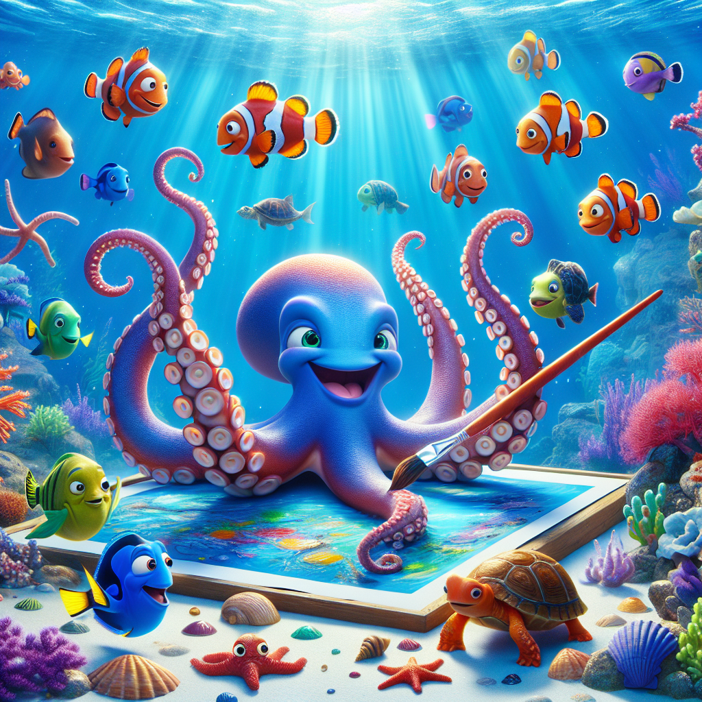 Dans un grand océan bleu où dansaient les poissons et chantaient les coquillages, vivait Poulpie, la pieuvre la plus talentueuse de toutes les profondeurs marines. Chaque jour, Poulpie se réveillait avec une nouvelle idée pour créer de magnifiques œuvres d’art. Il adorait peindre avec les couleurs éclatantes des algues et des coraux, et ses amis venaient souvent admirer ses créations.Un matin ensoleillé, Poulpie décida de préparer une grande exposition pour ses amis. “Je vais peindre un tableau géant de l’océan rempli de couleurs brillantes!” s’exclama-t-il, ses yeux pétillant d’excitation. Il se mit au travail, plongeant ses tentacules dans le bleu des vagues et le vert des algues.Ses amis, le poisson clown nommé Dali, la tortue sage appelée Tilly, et le crabe malicieux, Crabouille, s’étaient réunis pour l’encourager. “Tu es le meilleur artiste de l’océan, Poulpie!” s’écria Dali. Tilly hocha la tête, ajoutant : “Nous avons hâte de voir ton chef-d’œuvre!”Alors que Poulpie peignait, il remarqua que ses amis le regardaient avec admiration. Mais un jour, quelque chose d’étrange se produisit. En peignant, Poulpie commença à douter de lui-même. “Et si je ne réussis pas à faire quelque chose de beau ?” pensa-t-il, tremblant légèrement.Crabouille, qui avait vu l’inquiétude dans les yeux de Poulpie, s’approcha doucement. “Pourquoi ne pas ajouter un peu de rouge ici, et peut-être un peu de jaune par là?” proposa-t-il avec un sourire. Ces réflexions d’amis lui redonnèrent de la confiance. Poulpie se souvint alors que l’art, c’était aussi s’amuser et partager des moments avec ceux qu’il aimait.Finalement, le jour de l’exposition arriva. L’eau brillait de mille feux et tous les animaux marins étaient là : les poissons, les étoiles de mer et même quelques dauphins! Quand Poulpie dévoila son tableau, tous firent silence. Le tableau représentait un océan éclatant, avec des poissons colorés jouant parmi les vagues.Ses amis applaudirent et crièrent : “Bravo Poulpie! C’est magnifique!” La fierté emplit le cœur de la pieuvre. Il réalisa que ce n’était pas tant le tableau qui importait, mais le plaisir qu’il avait eu à créer et le soutien de ses amis qui le rendait heureux.Et depuis ce jour, Poulpie continua à peindre non seulement pour lui, mais aussi pour partager la joie et l’amour qu’il ressentait. Ainsi, chaque œuvre était un symbole d’amitié et de bonheur dans l’océan.Poulpie avait appris que l’important n’était pas de faire des choses parfaites, mais de partager sa passion avec ceux qu’il aimait.Moralité: