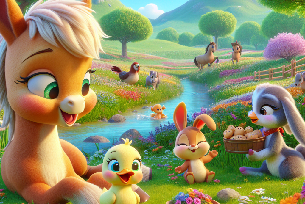 Poni le petit poney vivait dans une jolie prairie, remplie de fleurs colorées et de ruisseaux chantants. Il jouait tous les jours avec ses amis : Lila la lapine et Max le petit canard. Ensemble, ils couraient, sautaient et s’amusaient à attraper des papillons. Un jour, Poni ne se sentait pas bien. Ses petites jambes étaient faibles et il avait du mal à se lever. Sa maman poney était très inquiète et l’emmena chez le vétérinaire. Le vétérinaire annonça que Poni avait besoin de repos pour guérir et qu’il ne pouvait pas jouer avec ses amis pendant quelques jours.