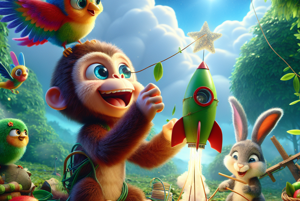 Il était une fois un petit singe nommé Donkey. Donkey était un singe très curieux et intelligent. Chaque jour, il se balançait d’arbre en arbre dans la forêt, mais son rêve le plus grand était d’aller dans l’espace pour voir les étoiles de près.