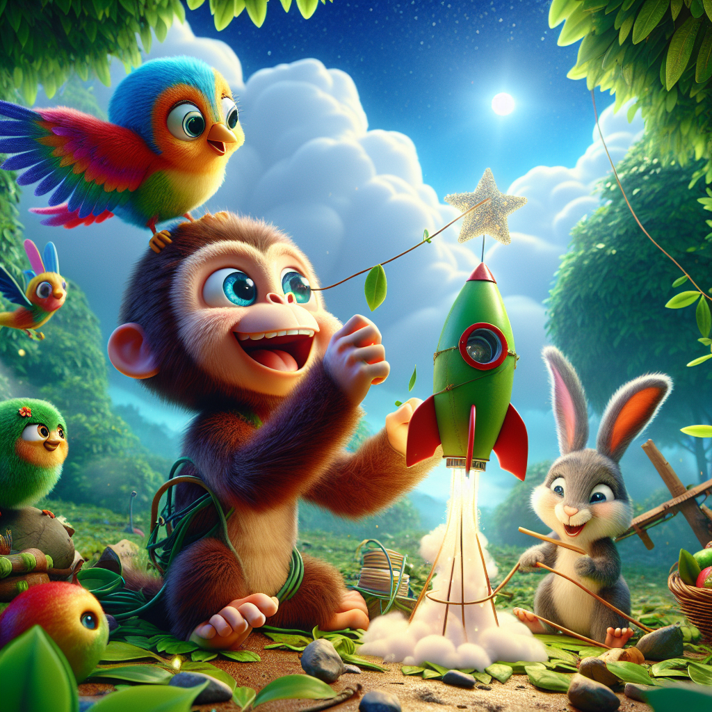 Il était une fois un petit singe nommé Donkey. Donkey était un singe très curieux et intelligent. Chaque jour, il se balançait d’arbre en arbre dans la forêt, mais son rêve le plus grand était d’aller dans l’espace pour voir les étoiles de près.